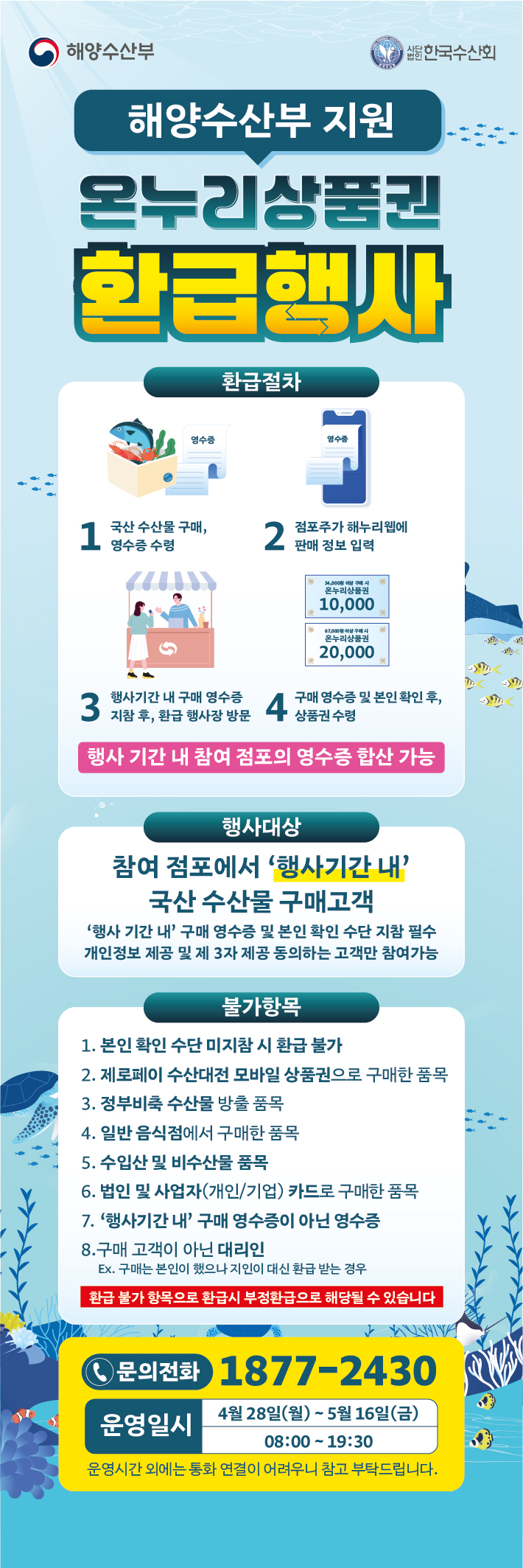 | 품목 조건 | 국내산 수산물 또는 원물 기준 70% 이상 국내산 가공품 | 환급 가능 |